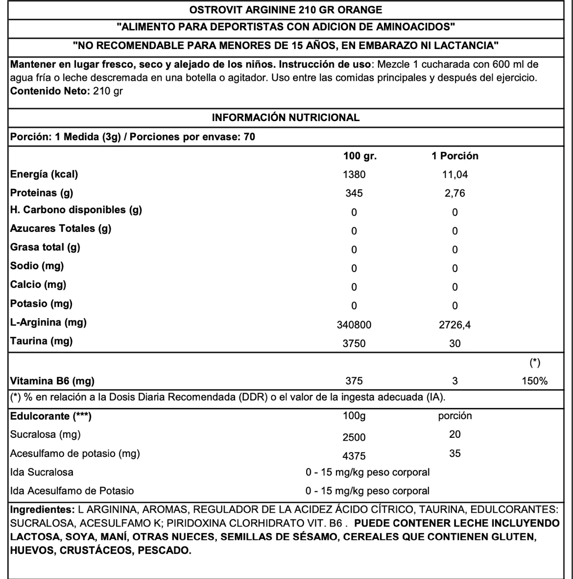 Ingredientes: L-arginina, aromas, corrector de acidez – ácido cítrico, taurina, edulcorantes: sucralosa, acesulfamo K; clorhidrato de piridoxina (vitamina B6). El producto puede contener trazas de leche (incluyendo lactosa), soja, cacahuetes, otros frutos secos, semillas de sésamo, avena, huevos, crustáceos, pescado.